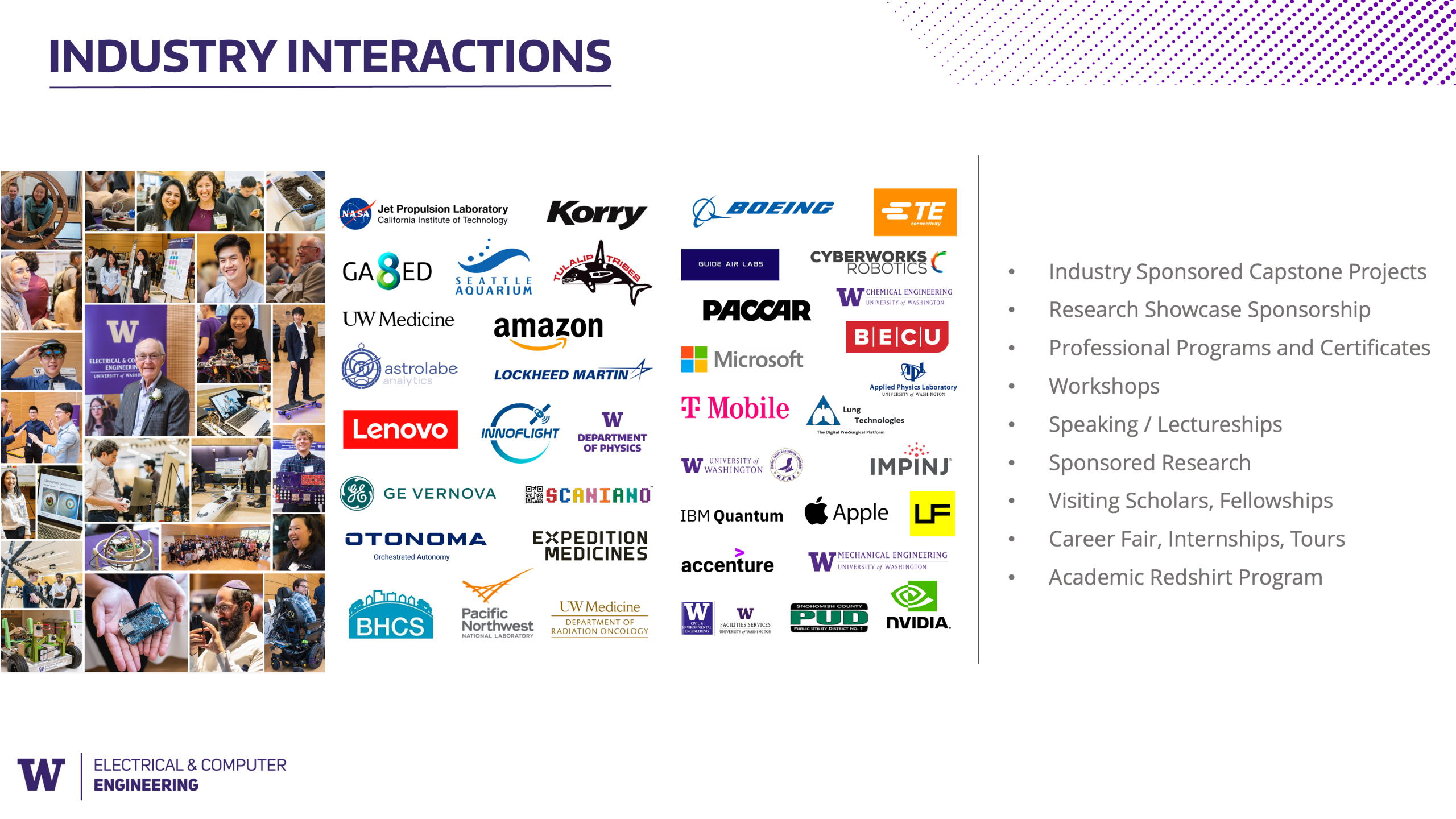 UW ECE continues to lead in cutting-edge science and technology while advancing socially-responsible innovation. Our innovation ecosystem is critical in promoting an entrepreneurial mindset in our teaching, and is strengthened through diverse partnerships that address complex global challenges in health, energy, technology and the environment.